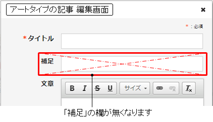 アートタイプの記事では、「タイトル」と「補足」の欄がありますが、「タイトル」のみに簡略化を図るため、「補足」の入力欄が無くなります。