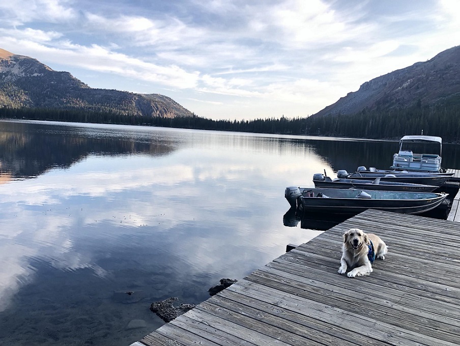 早朝の湖の桟橋に座り(米・カリフォルニア州、メアリー湖)