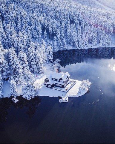 雪景色に佇む湖畔の家(トルコ・ギョルジュク自然公園)