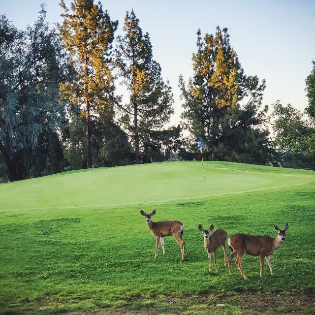 夜明けのゴルフ場に集うシカたち(米・カリフォルニア州)