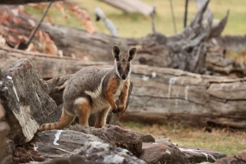 岩陰から見つめる小さなカンガルー(シマオイワワラビー、オーストラリア)