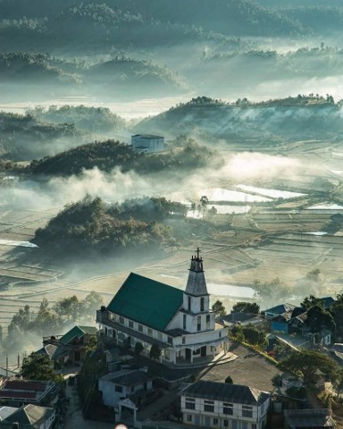 小高い丘の上に立つ町の教会(インド・ミゾラム)