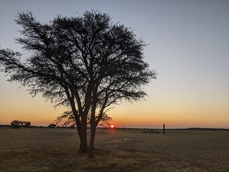 夕暮れのカラハリ砂漠に立つ木(南アフリカ、カラハリ・トランスフロンティア公園)