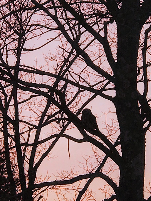 夕暮れの木に止まる1羽の影(アメリカフクロウ)
