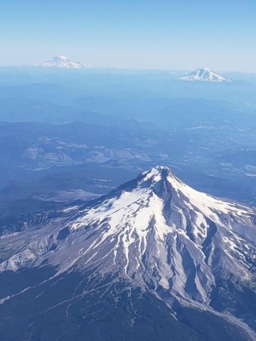 あいだをとってそびえる三山(米・フッド山、アダムズ山、レーニア山)