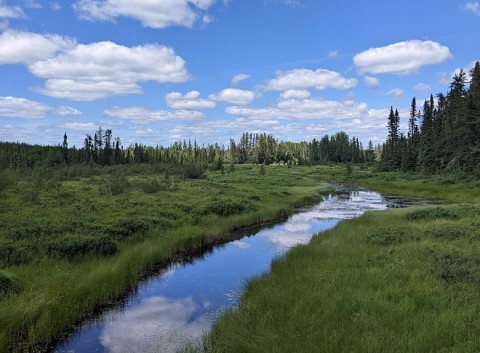 空を映す草原の小川