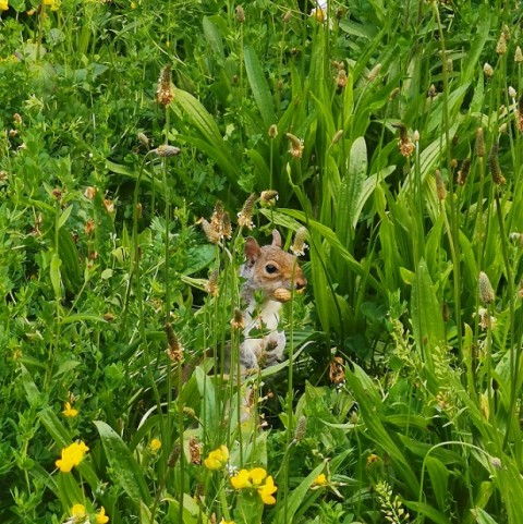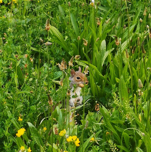 公園の緑地にまぎれ、木の実をくわえて(ロンドン、セント・ジェームズ・パーク)
