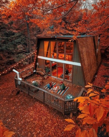紅葉に染まる森のキャビンで(米ニューヨーク州・タナーズビル)