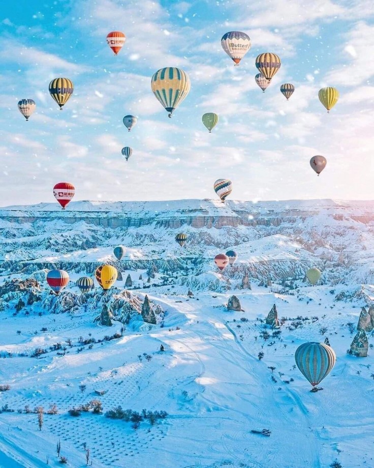 雪の高原に浮かぶカラフルな気球(トルコ・カッパドキア)