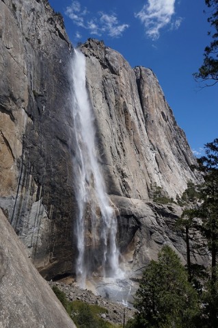 そり立つ岩壁を流れ落ちる荘厳な滝(米・ヨセミテ滝)