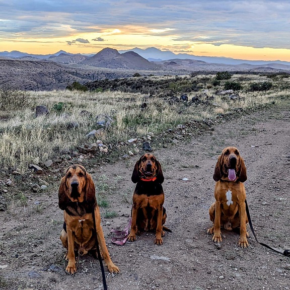 夕暮れの山道に3匹で座り(ブラッドハウンド犬)