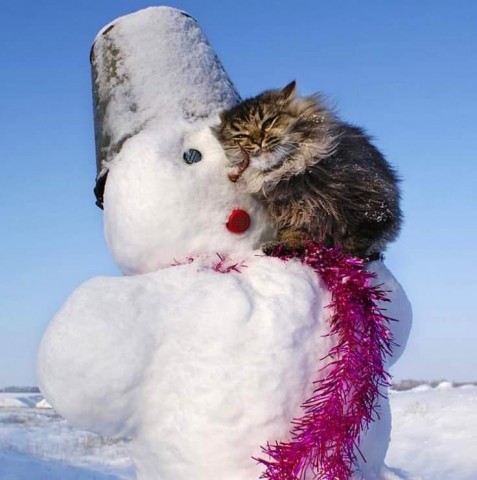 大きな雪だるまに寄り添って