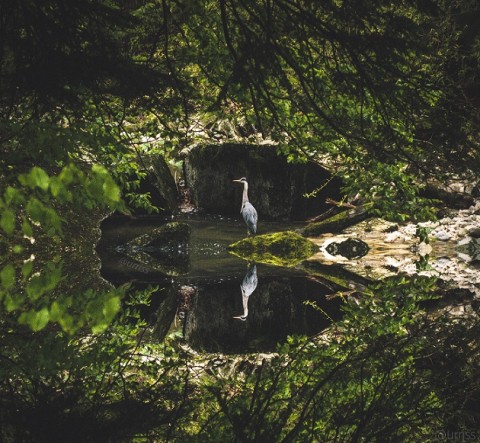 静かな水辺に佇む青色の水鳥(アオサギ)