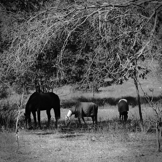 木の下で草をはむ馬の親子