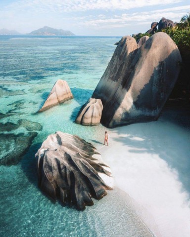 透明な海と奇岩の浜辺(セーシェル諸島)