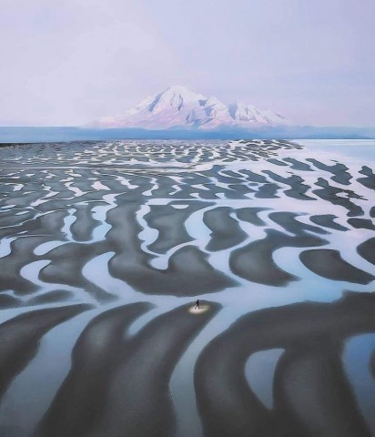 広大な砂浜の先にそびえる白い山(カナダ・ベーカー山)