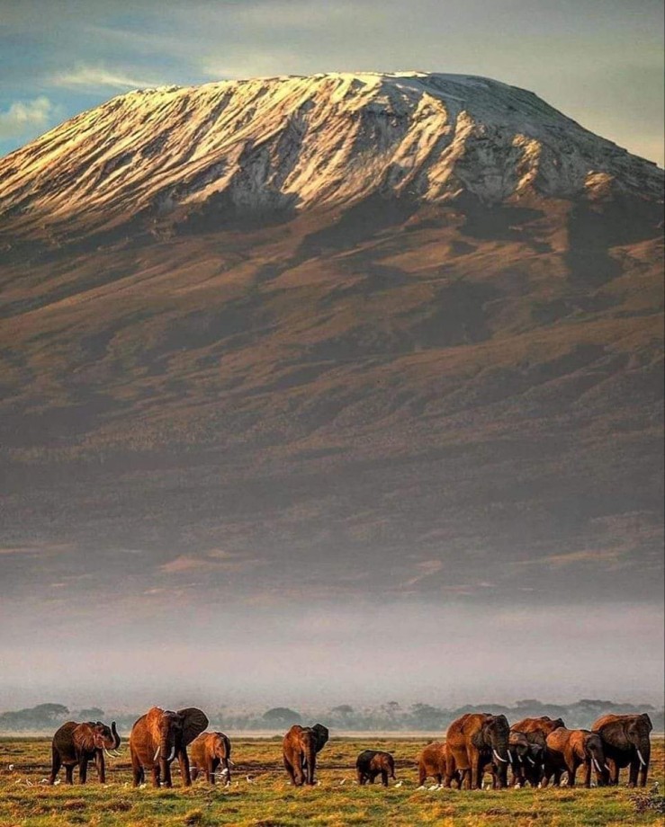 キリマンジャロのふもとを歩くゾウの群れ(タンザニア)