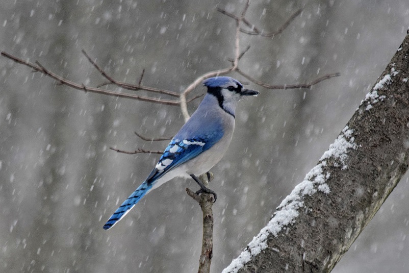 雪中の枝にとまる青い鳥(アオカケス、米・エリコットシティ)