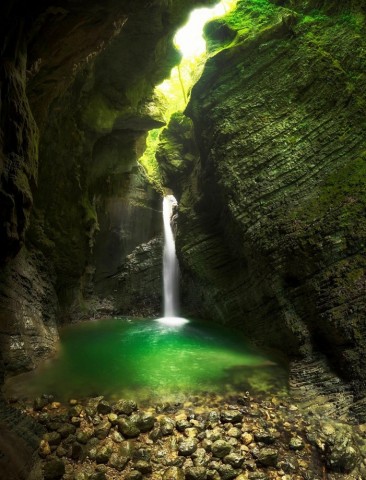 岩の間から静かに流れ落ちるコジャク滝 (スロベニア)