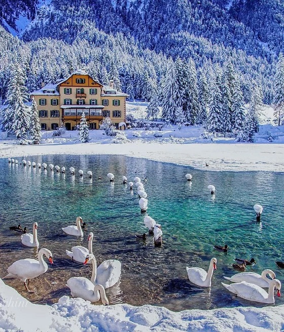 冬の湖畔に集う水鳥たち(イタリア・ドッビアーコ湖)