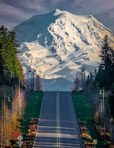 道の先にそびえる大きな雪山(アメリカ・レーニア山)
