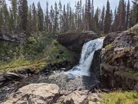 森の中を流れ落ちる美しい滝(米・イエローストーン国立公園、ムース滝)