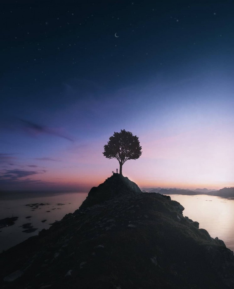 夜空に浮かぶように立つ一本の木の影