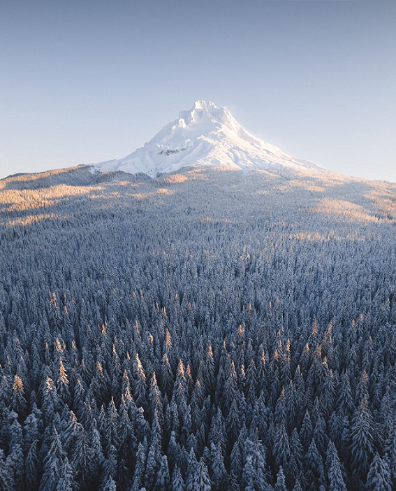 深い森の奥にたたずむ白き山(フッド山、米・オレゴン州)