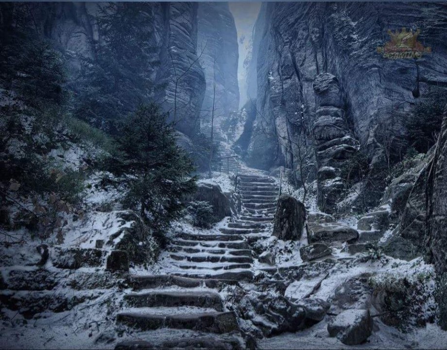冬の岩山の間に続く石段の小道(チェコ・プラホフの岩)
