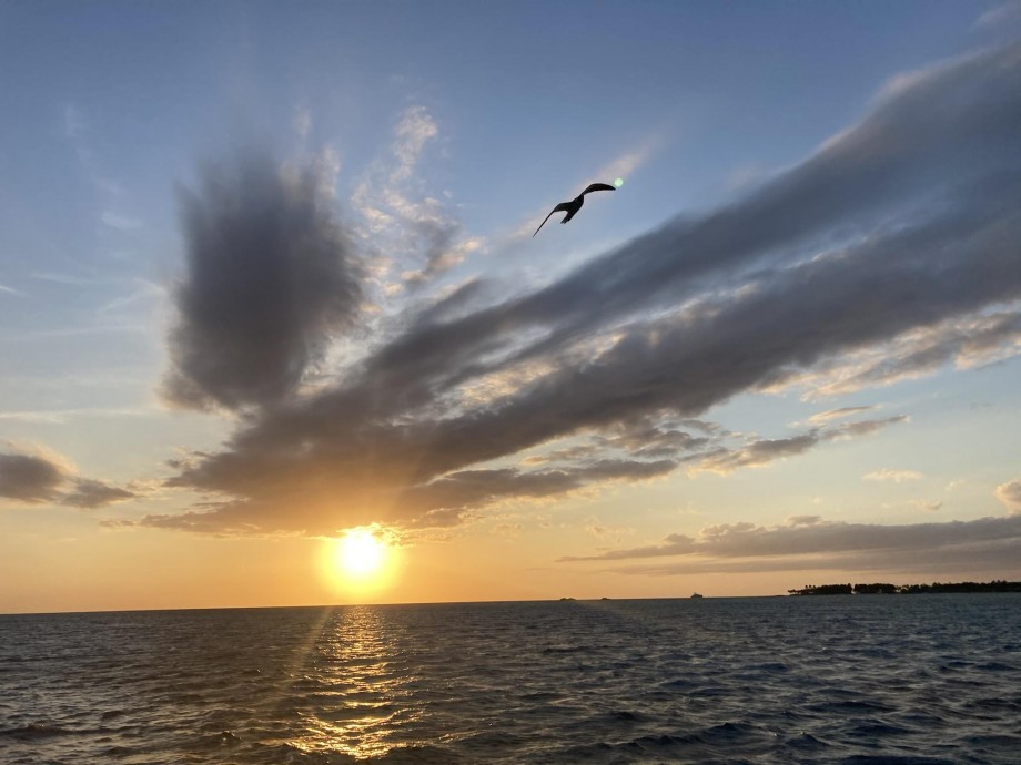 朝日を背に舞う海上のカモメ(バハマ、ビミニ諸島)