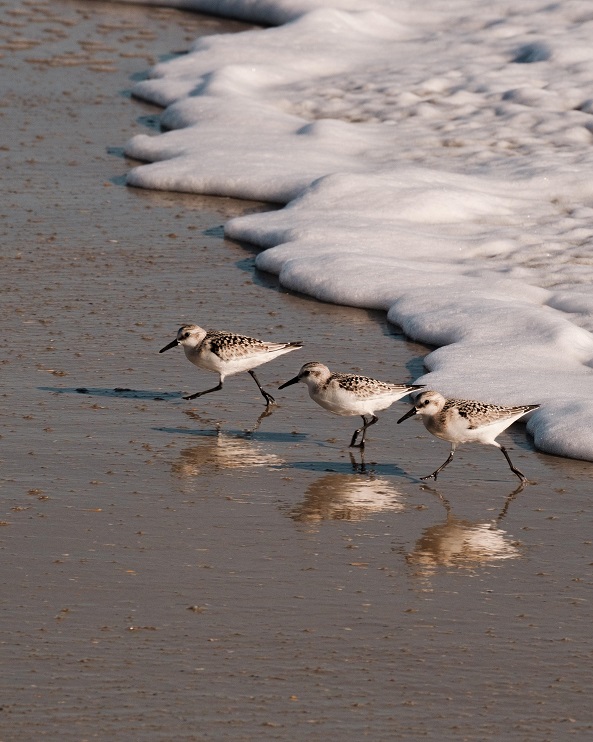 波打ち際を歩く三羽の小さな海鳥(ミユビシギ)