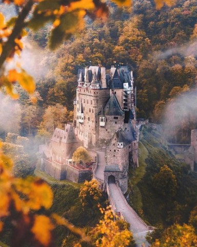 木々が色づく山に立つ中世の城(ドイツ・エルツ城)