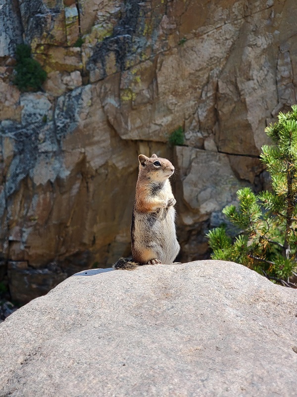 岩の上にちょこんと立って(キンイロジリス、米・ロッキーマウンテン国立公園)