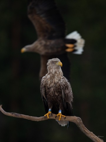 空を舞い、枝に止まる2羽(オジロワシ、スウェーデン)
