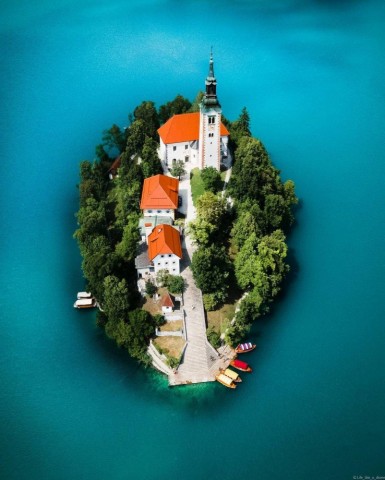 湖の中の教会が立つ小さな島(スロベニア・ブレッド湖)