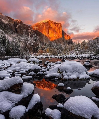 オレンジ色に染まる冬の岩山(米・ヨセミテ国立公園)