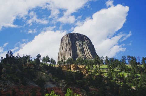 空にそびえる巨大な切り株のような岩山(米・デビルスタワー)