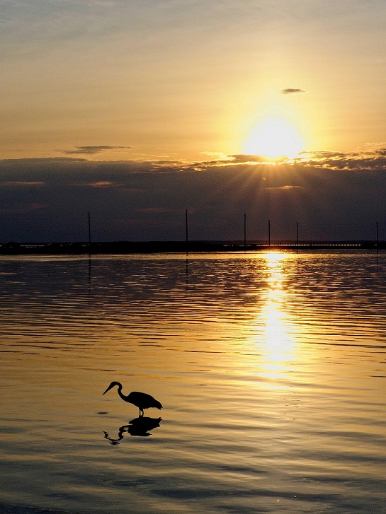 夕映えの水面に立つオオアオサギ(米メリーランド州・チェサピーク湾)