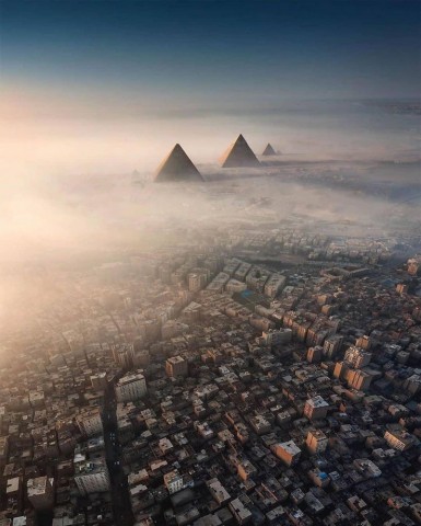 霧中に浮かぶ3ピラミッド(エジプト、ギザ)