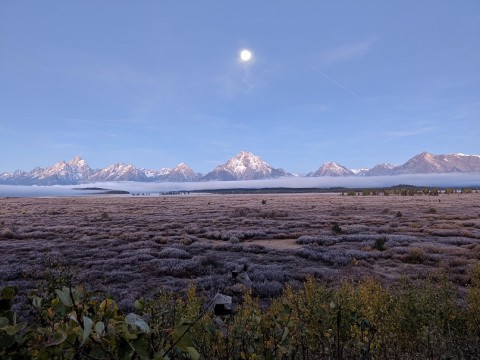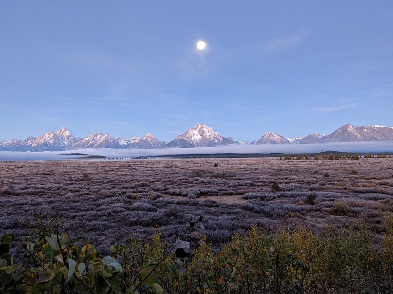地平の先にそびえる雪の山脈(米・グランドティトン国立公園)