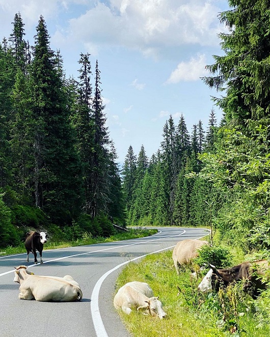 森を通る道の上でのんびりと(牛、ルーマニア)