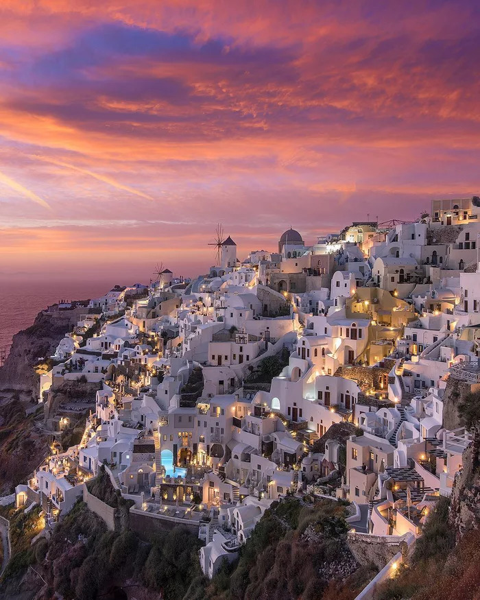 夕暮れのエーゲ海を望む白壁の家並み(ギリシャ・サントリーニ島)