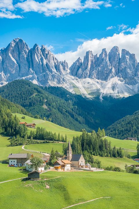 気高い山のすそ野に広がる小さな村(イタリア・ドロミーティ)