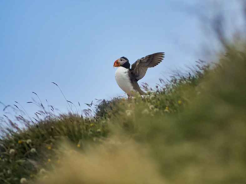 丘の上で翼を広げて(ニシツノメドリ、アイスランド)