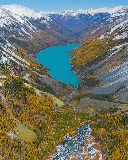 山あいに青い水をたたえる湖(ロシア・クチェリンスコエ湖)