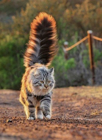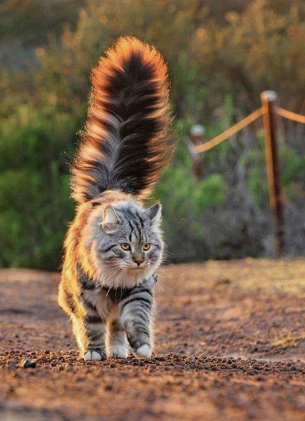 ふわふわの尾をたてて歩く(猫)