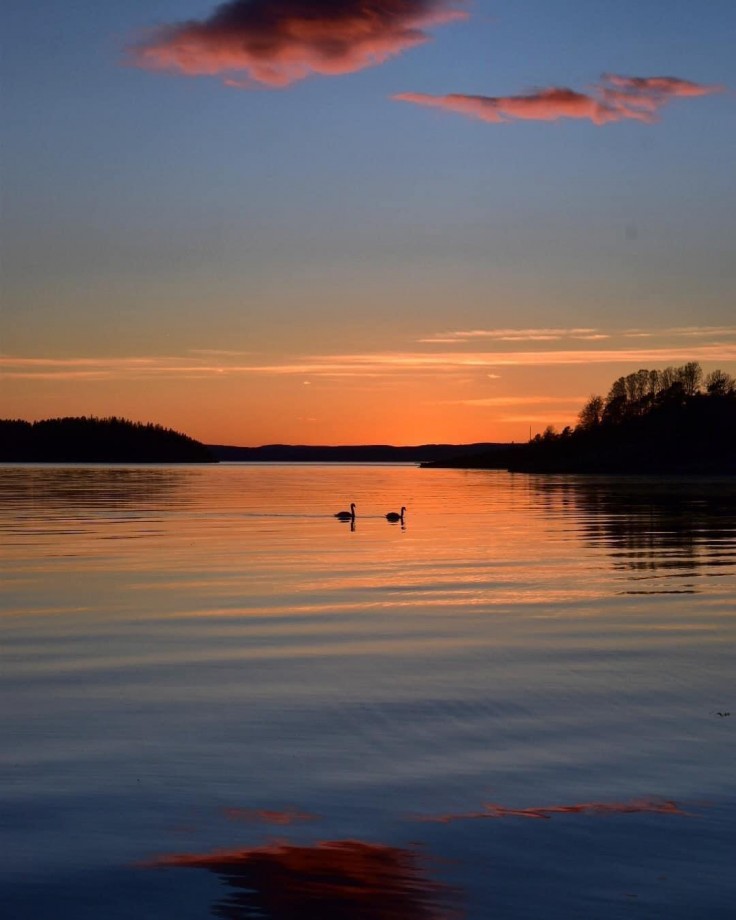 オレンジ色の水面に浮かぶ2羽の白鳥(ノルウェー)