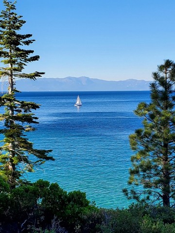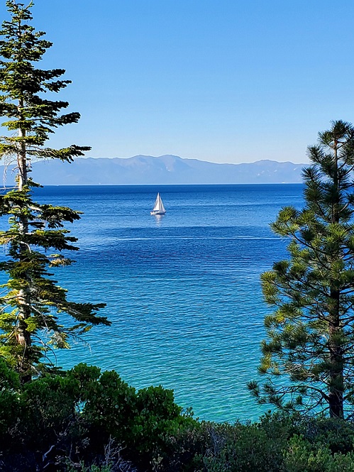 緑の向こうに広がる青い湖(米・カリフォルニア州、タホ湖)