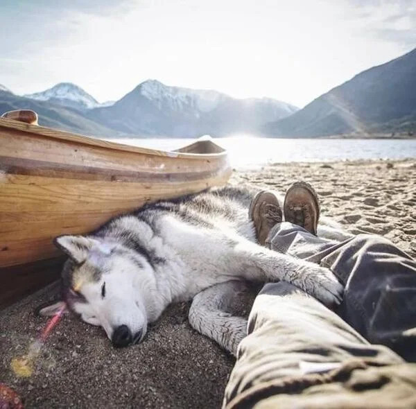 湖畔で寄り添ってお昼寝