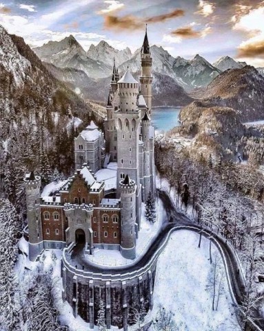 雪景色に立つ白亜の城(ドイツ・ノイシュヴァンシュタイン城)